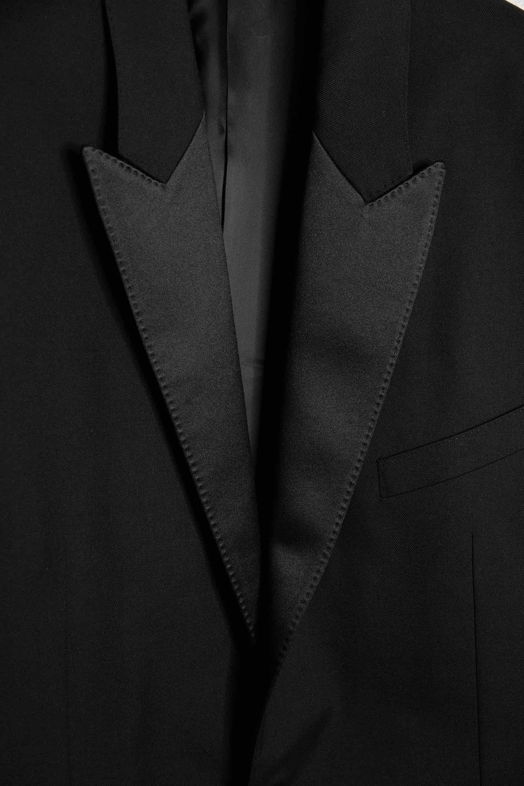 Black classic smoking jacket. Main fabric: 100% linen. Second fabric: 100% polyester. Lining: 54% cupro. 46% viscose.
