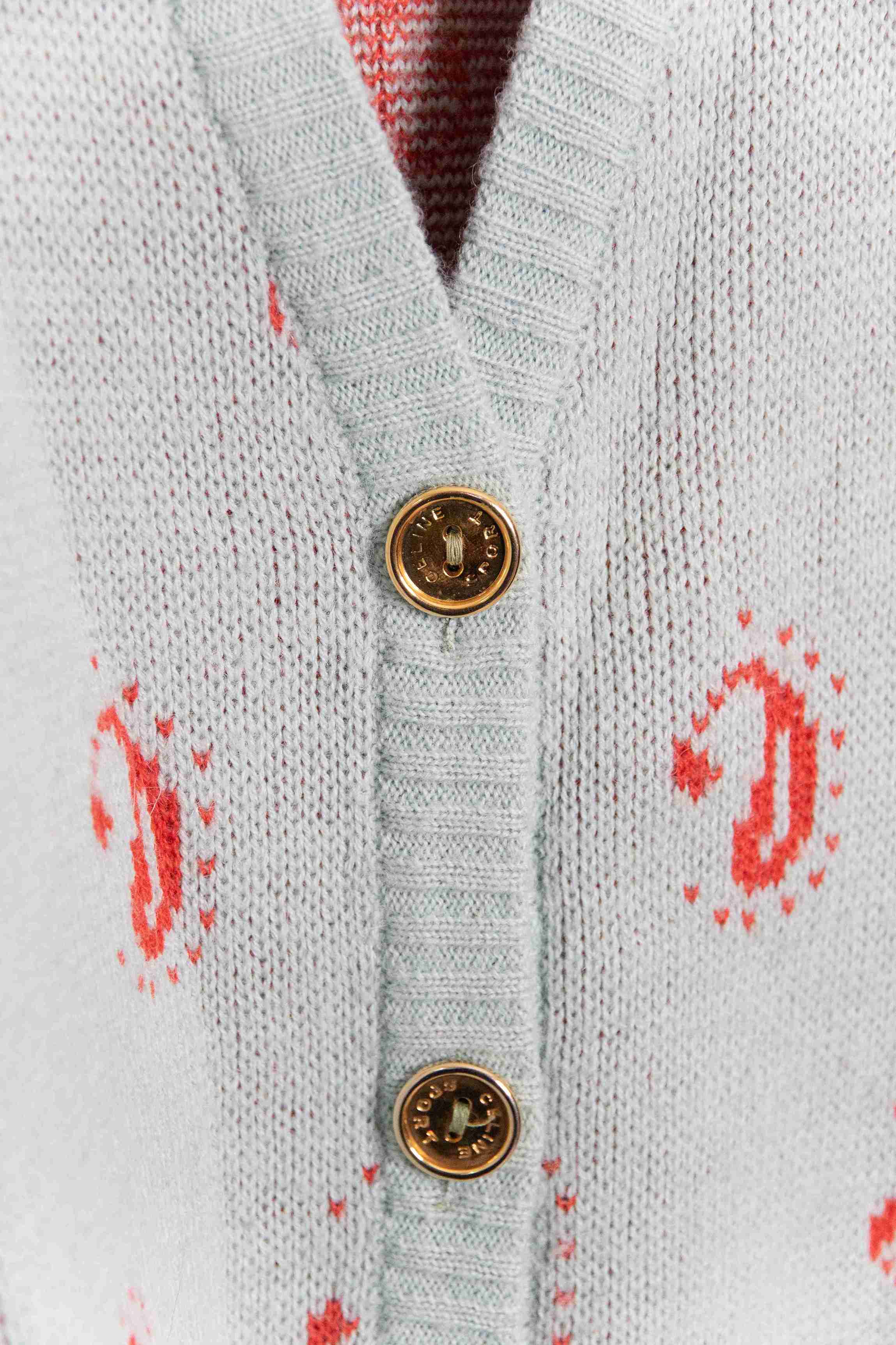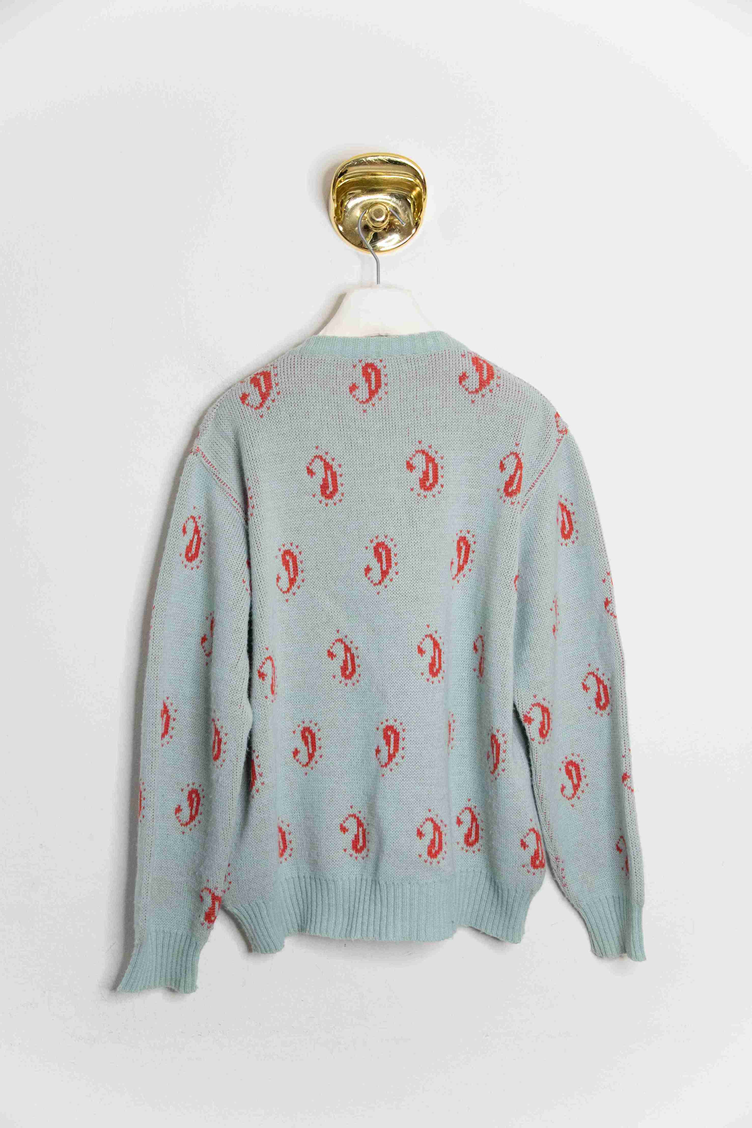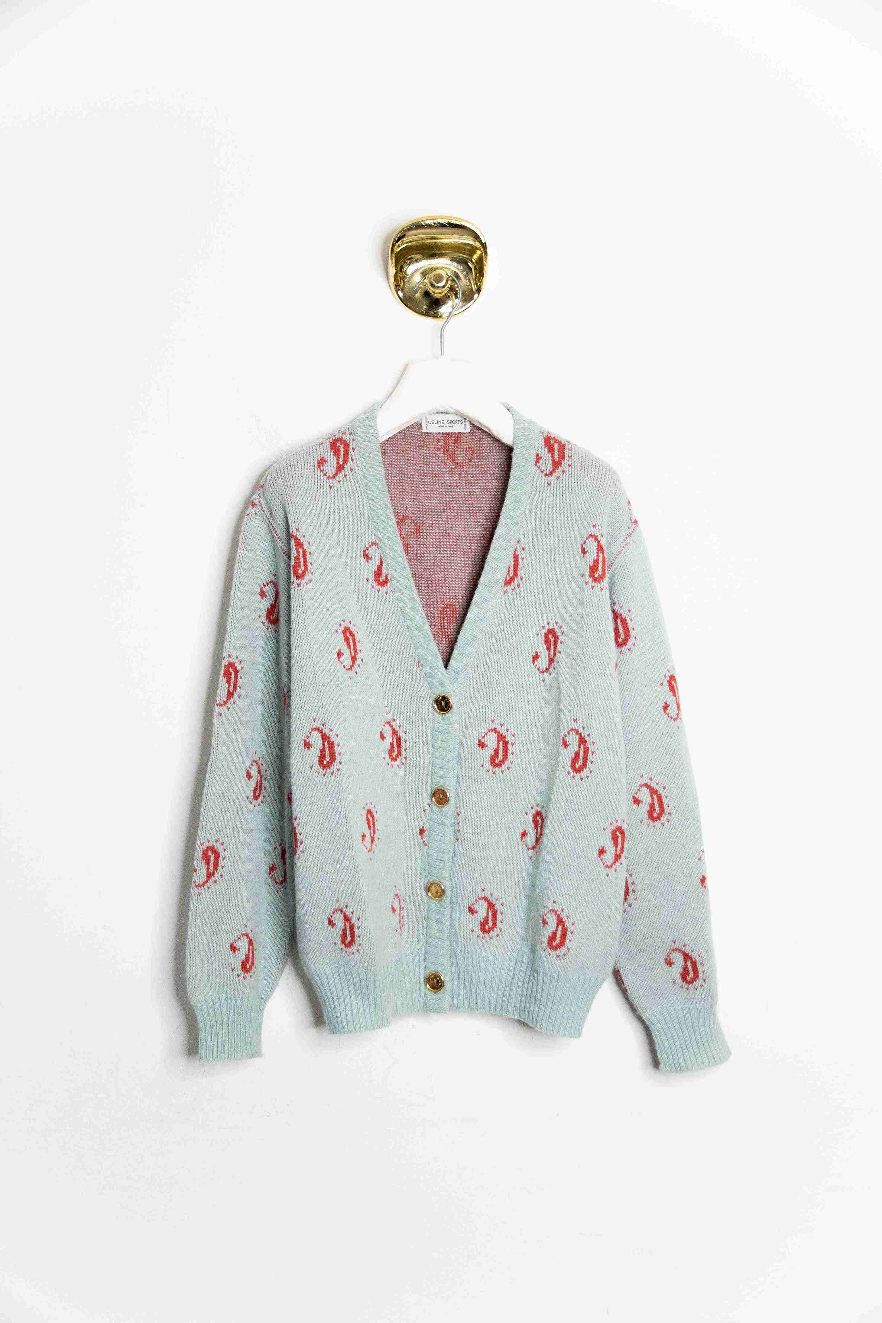 Light blue cardigan. Red paisley print. Golden buttons. Material label missing.