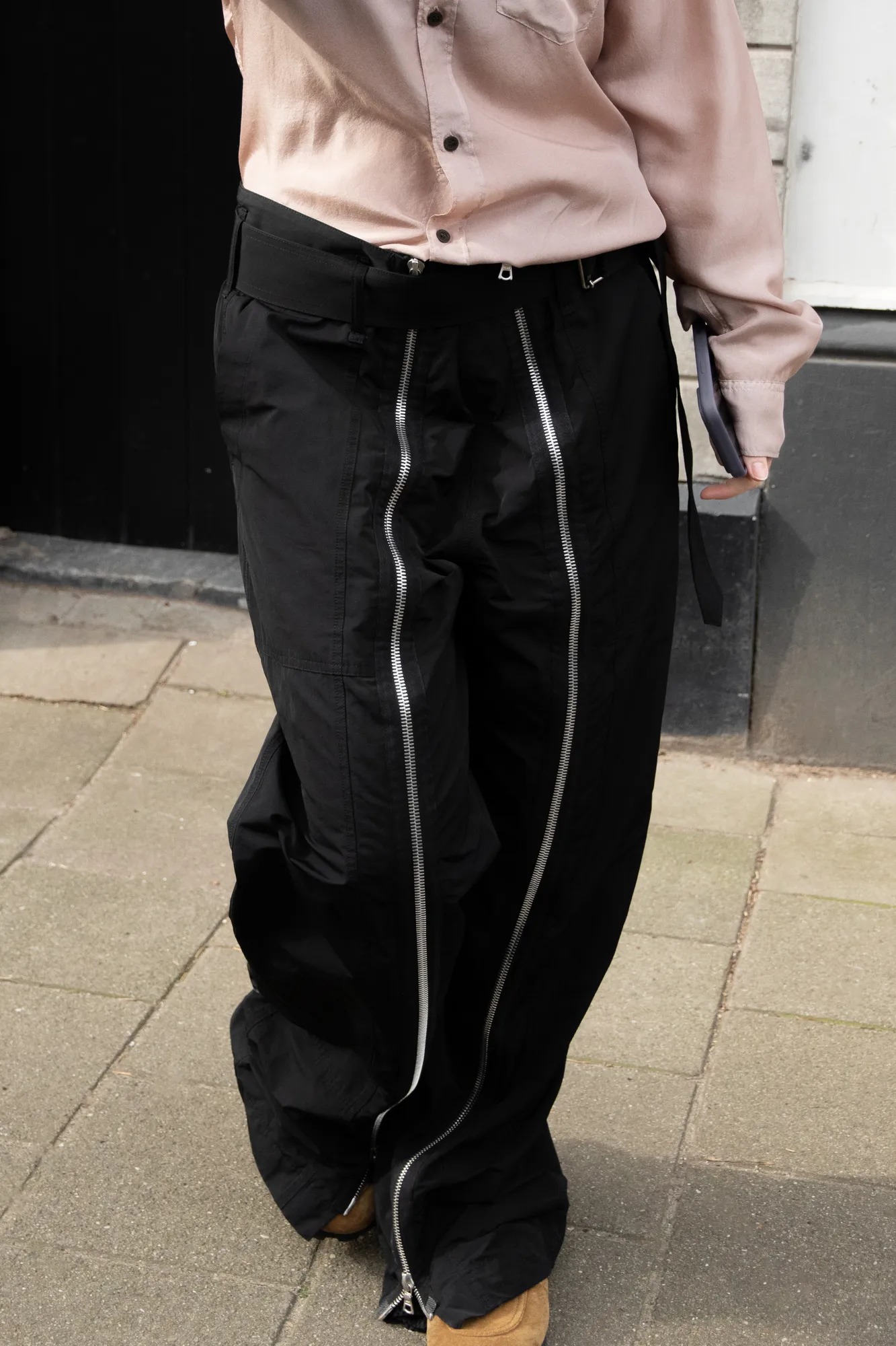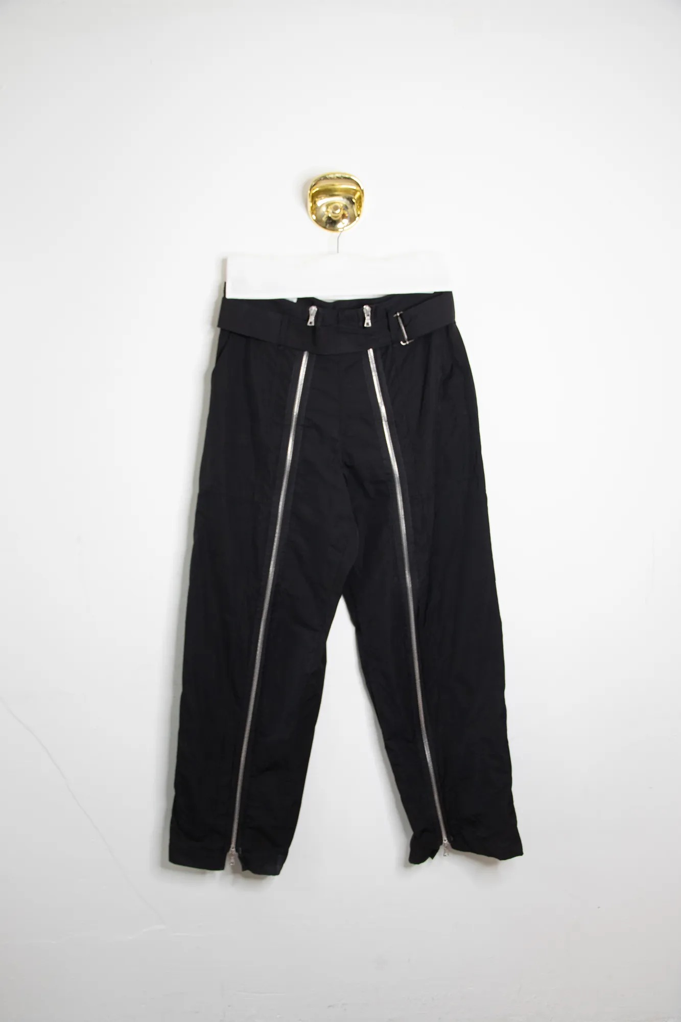 Dries van Noten men's nylon straight trousers with metal zippers and belt. Flap pocket on the back.