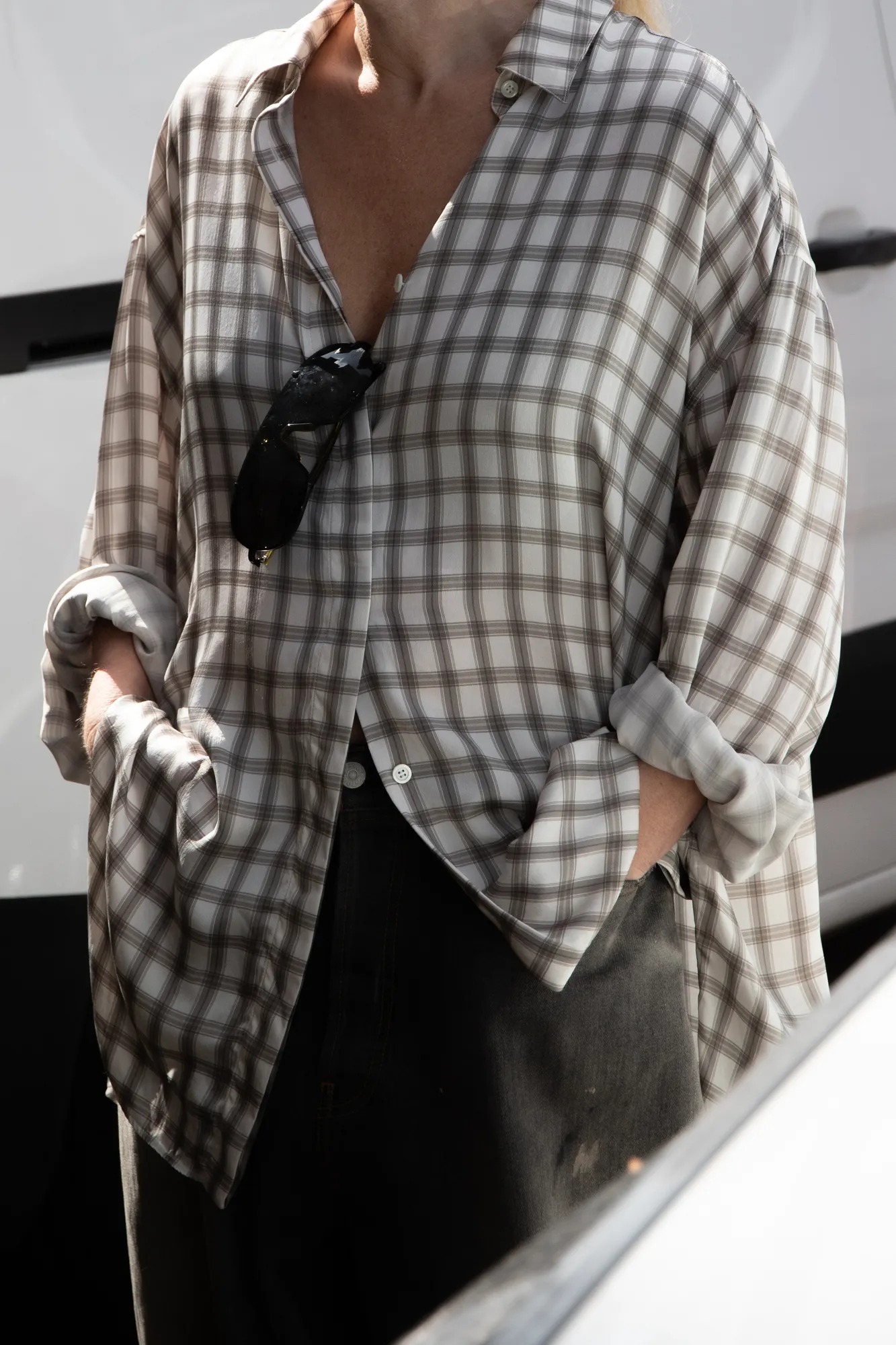 Loewe checkered blouse with buttons on sleeves and sides. Visible stain on back. 100% silk.
