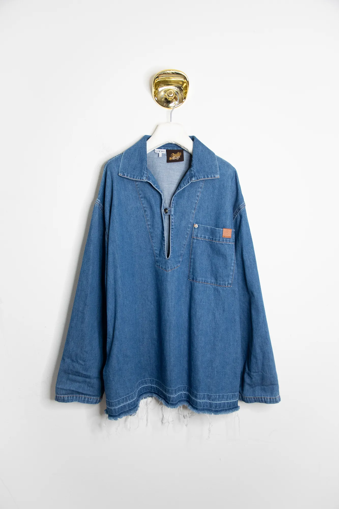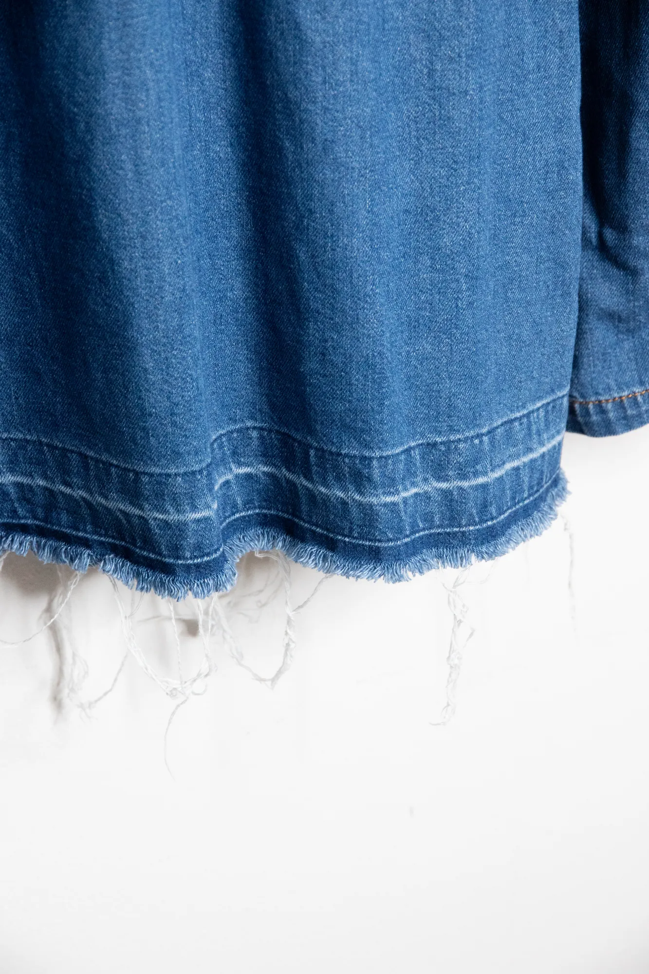 Blue denim top with polo v-neck. Chest pocket. Fringy bottom. With pockets. 100% cotton.