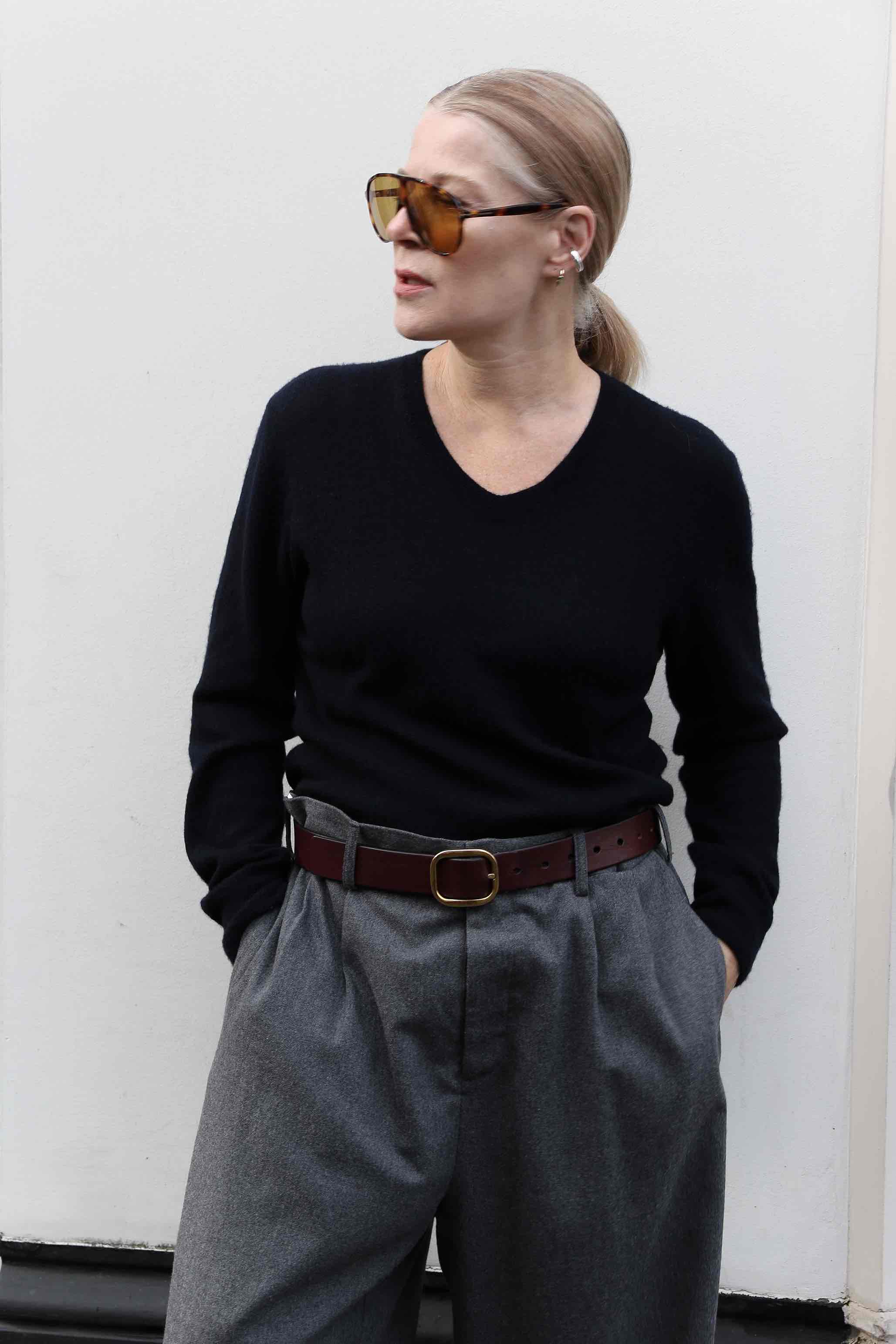 Grey pleated pants. 87% wool. 11% polyamide. 2% elastane.