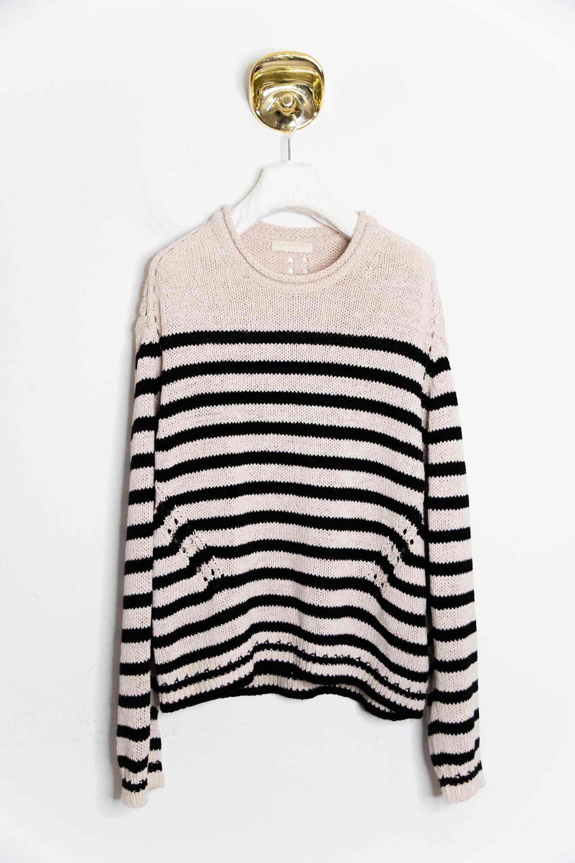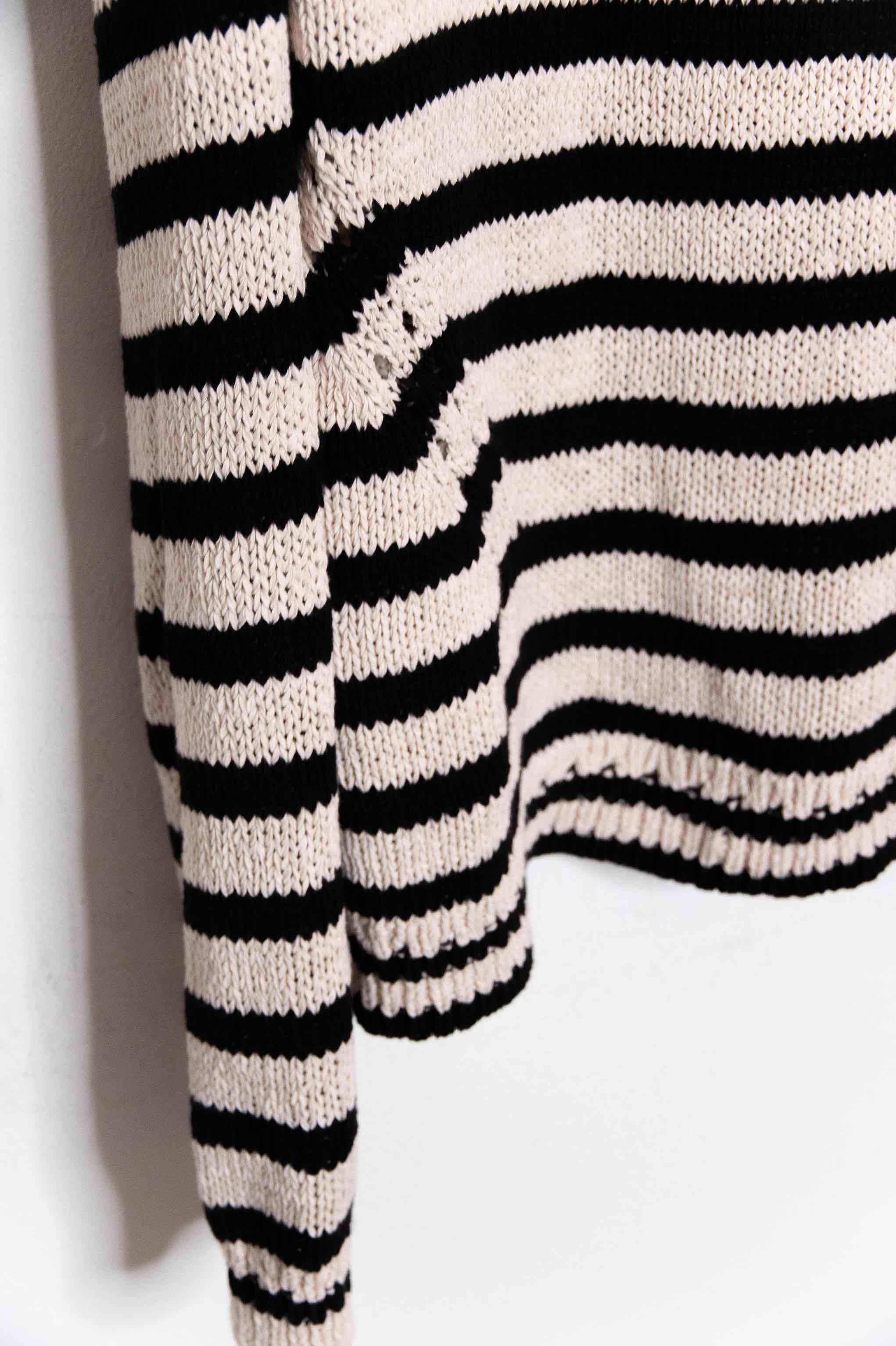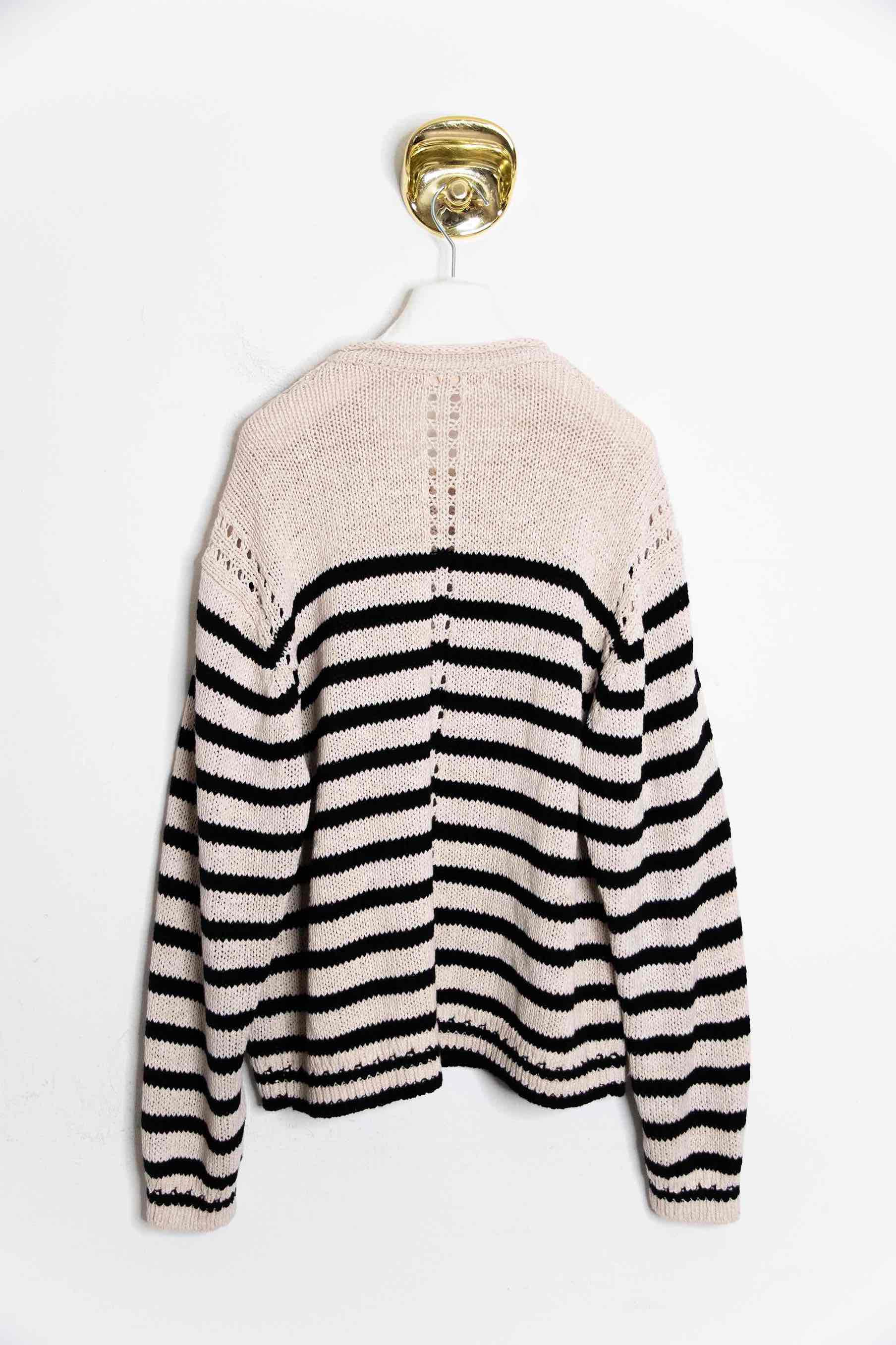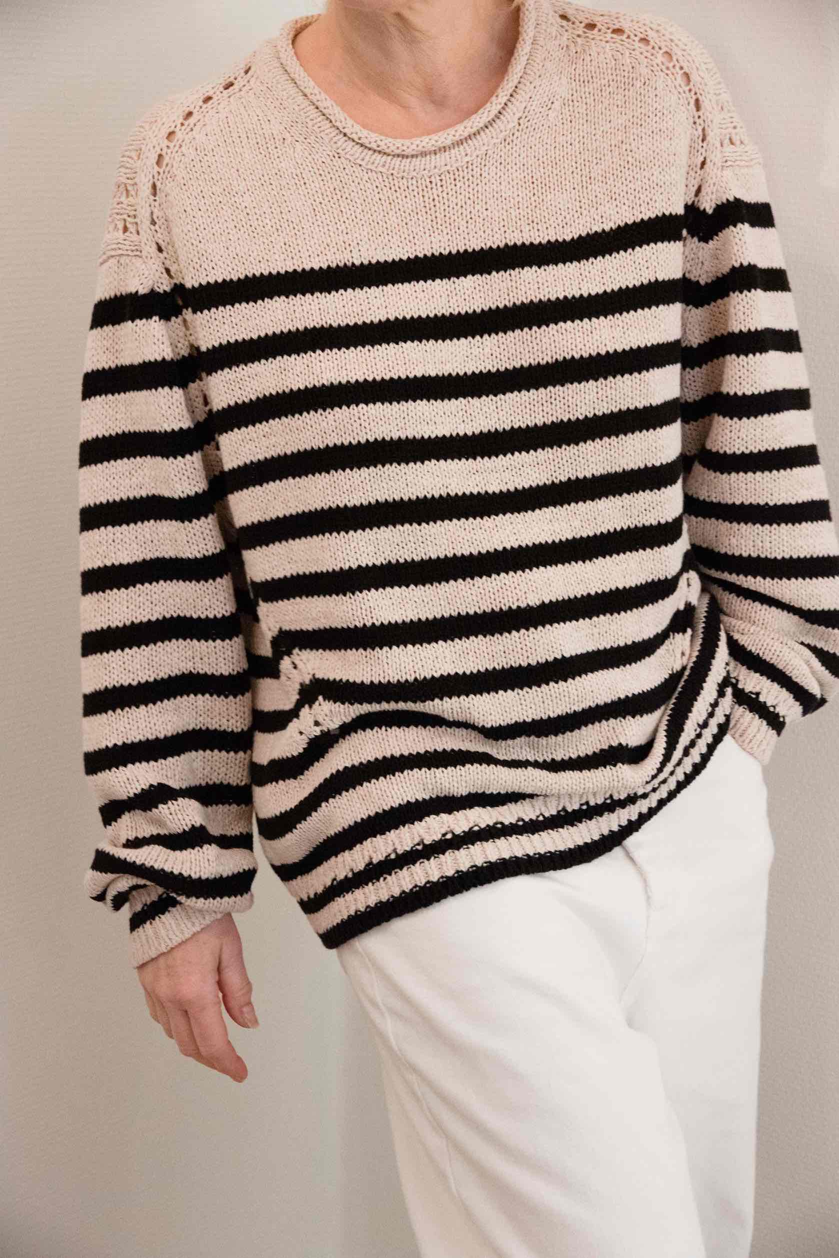 Beige Pullover with black stripes. 66% cotton. 34% polyamide.