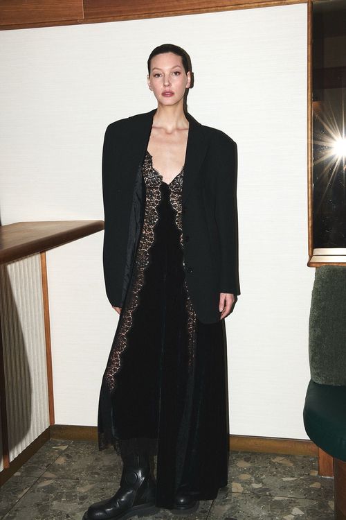 Black velvet asymmetrical maxi slip dress with lace detailing. 82% viscose 18% silk.