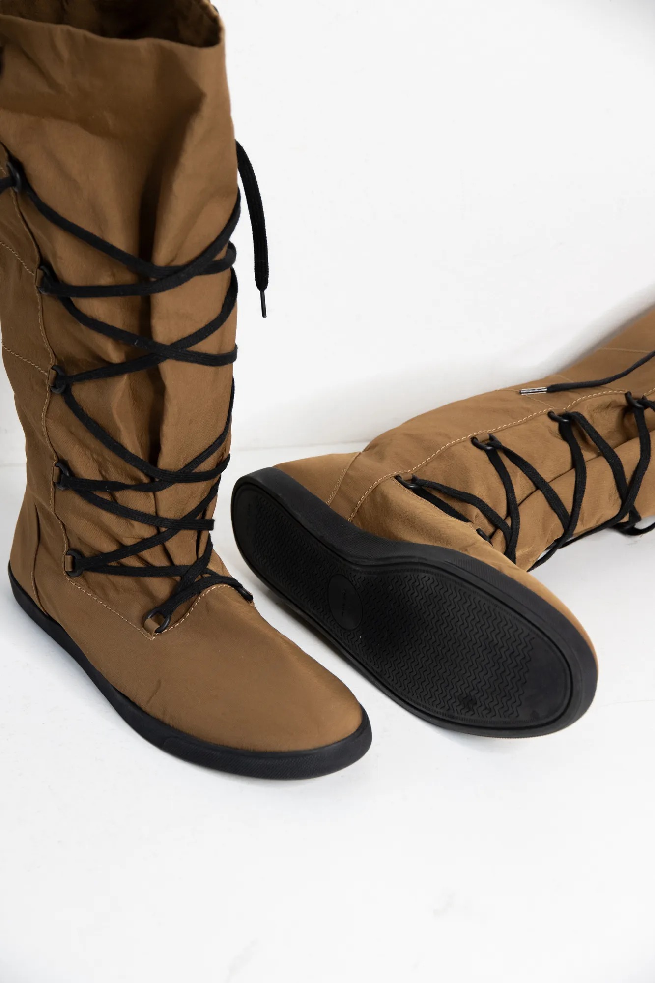 The Row tobacco nylon boots. Calf height and black laces.