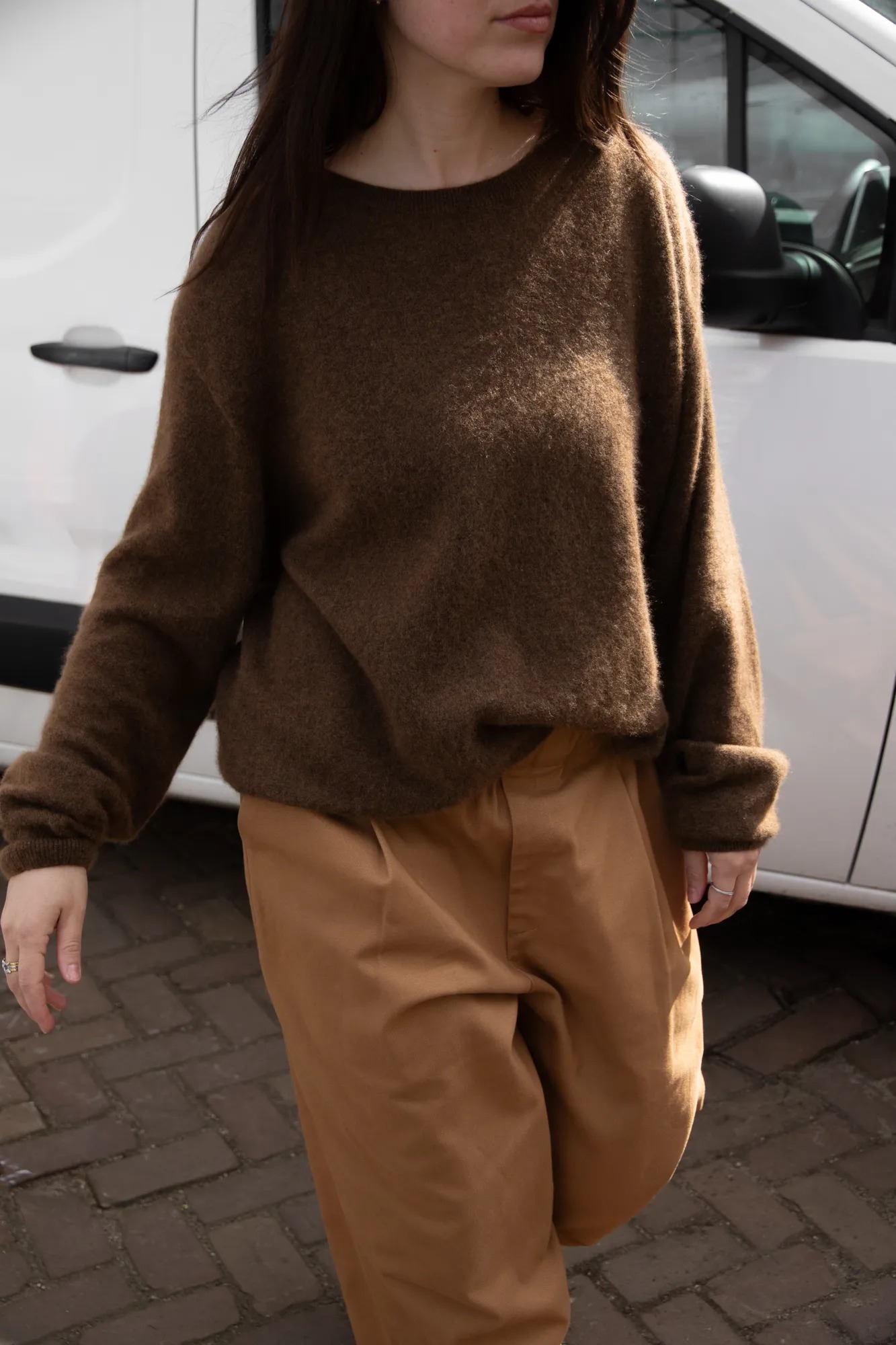 The Row tobacco brown Lorynna crewneck sweater. 65% cashmere, 35% silk.