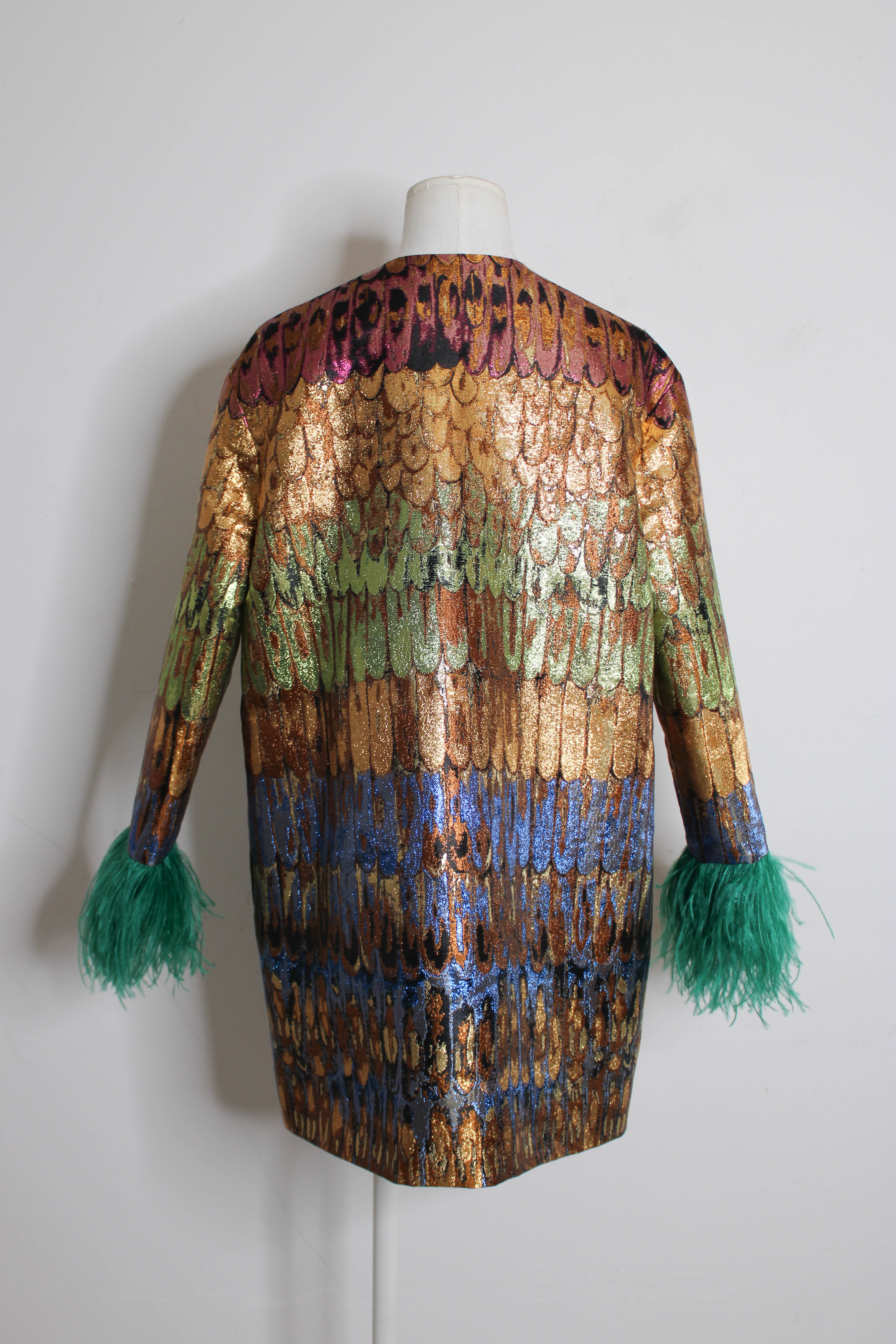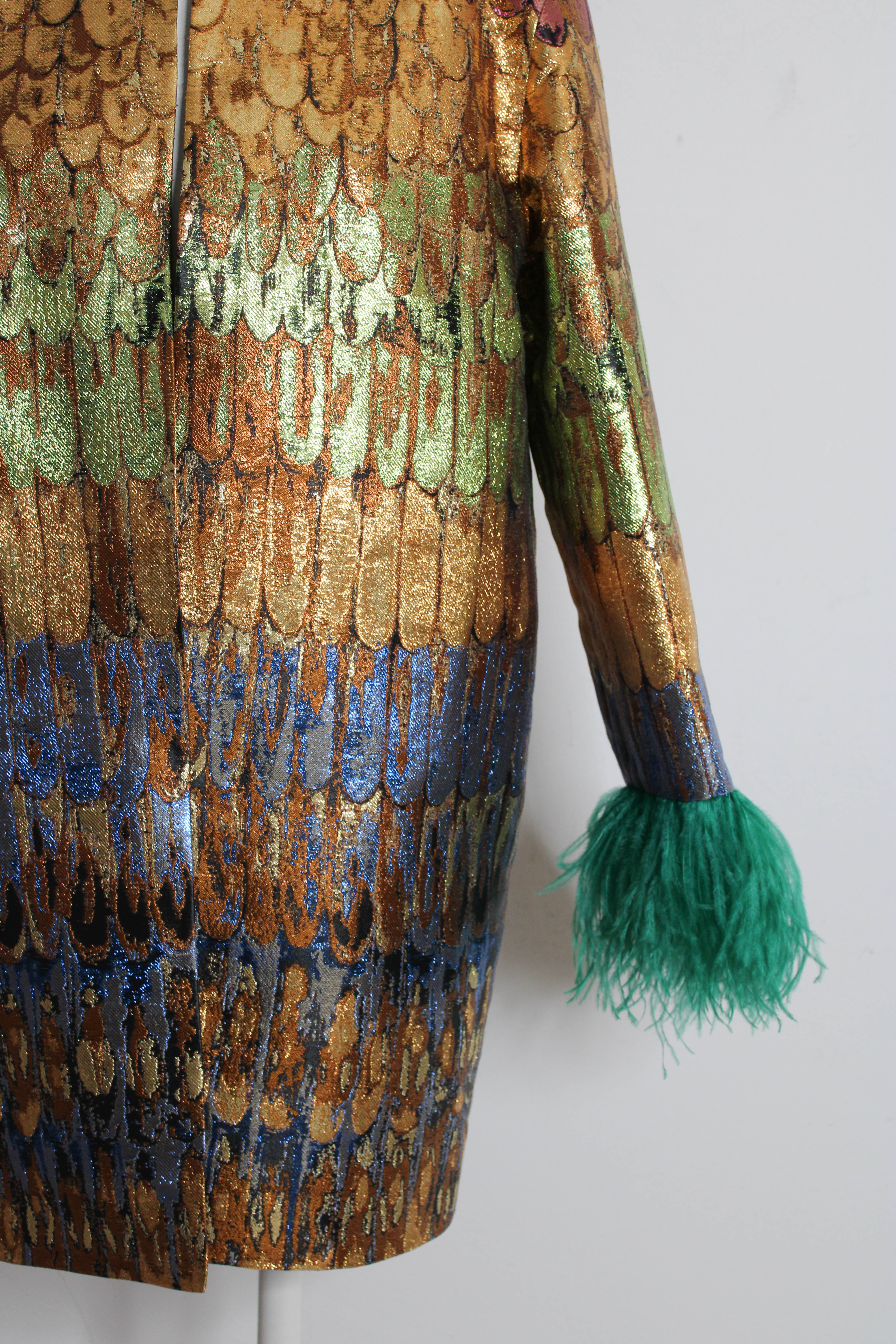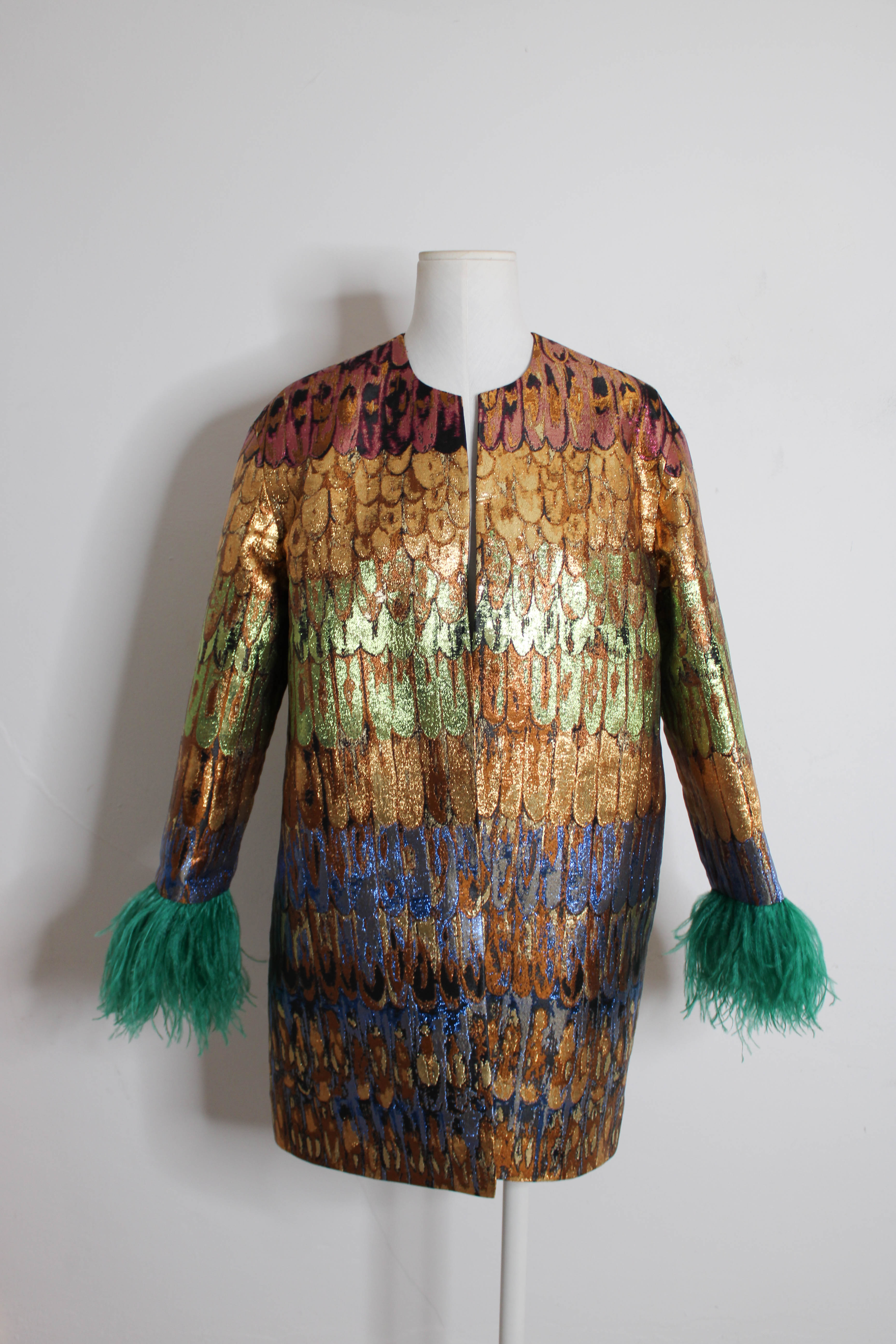 Gold/Multicolor mantel with feathers on the cuffs. 68% polyester. 22% metallic. 14% polyamids.