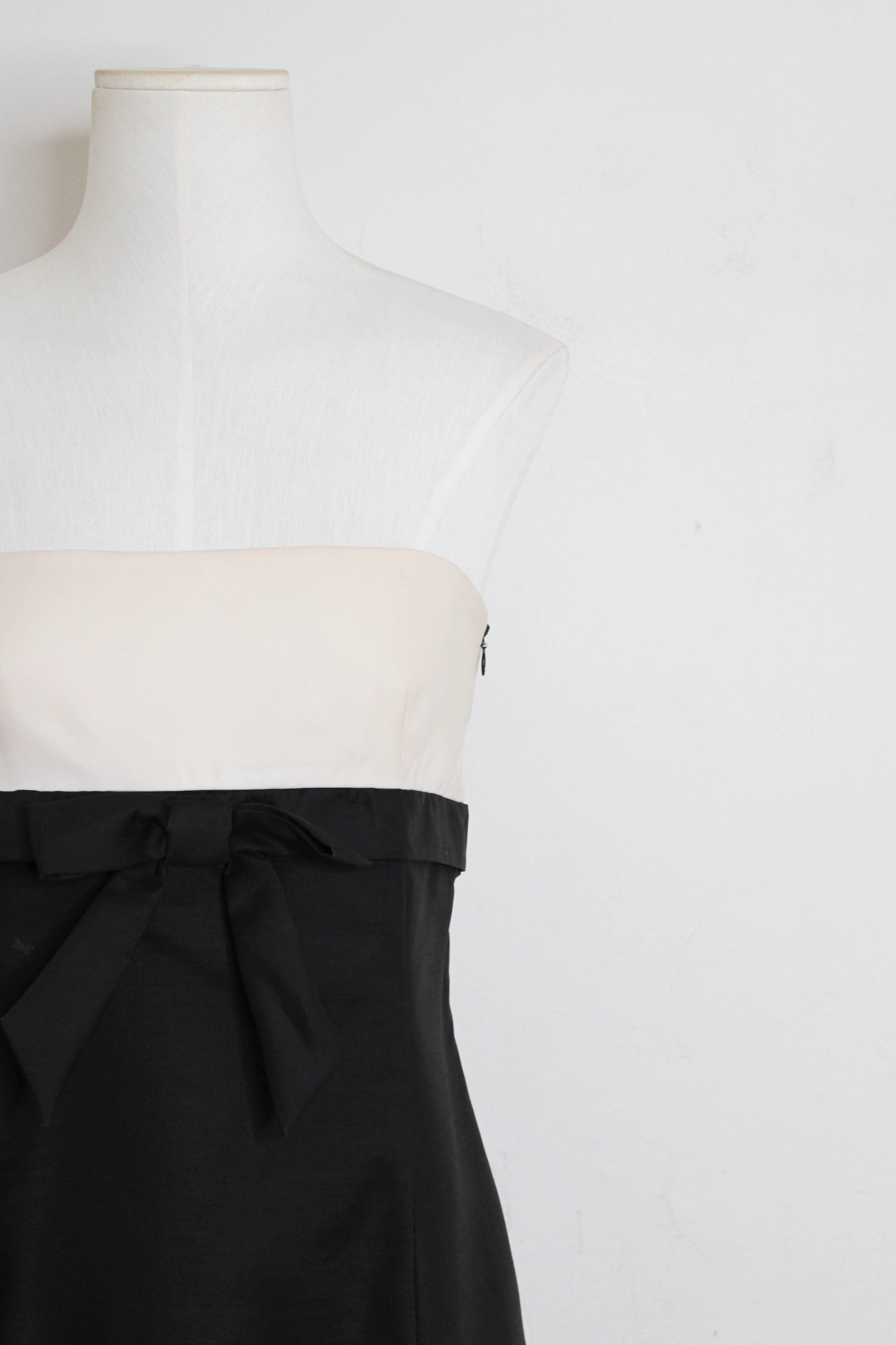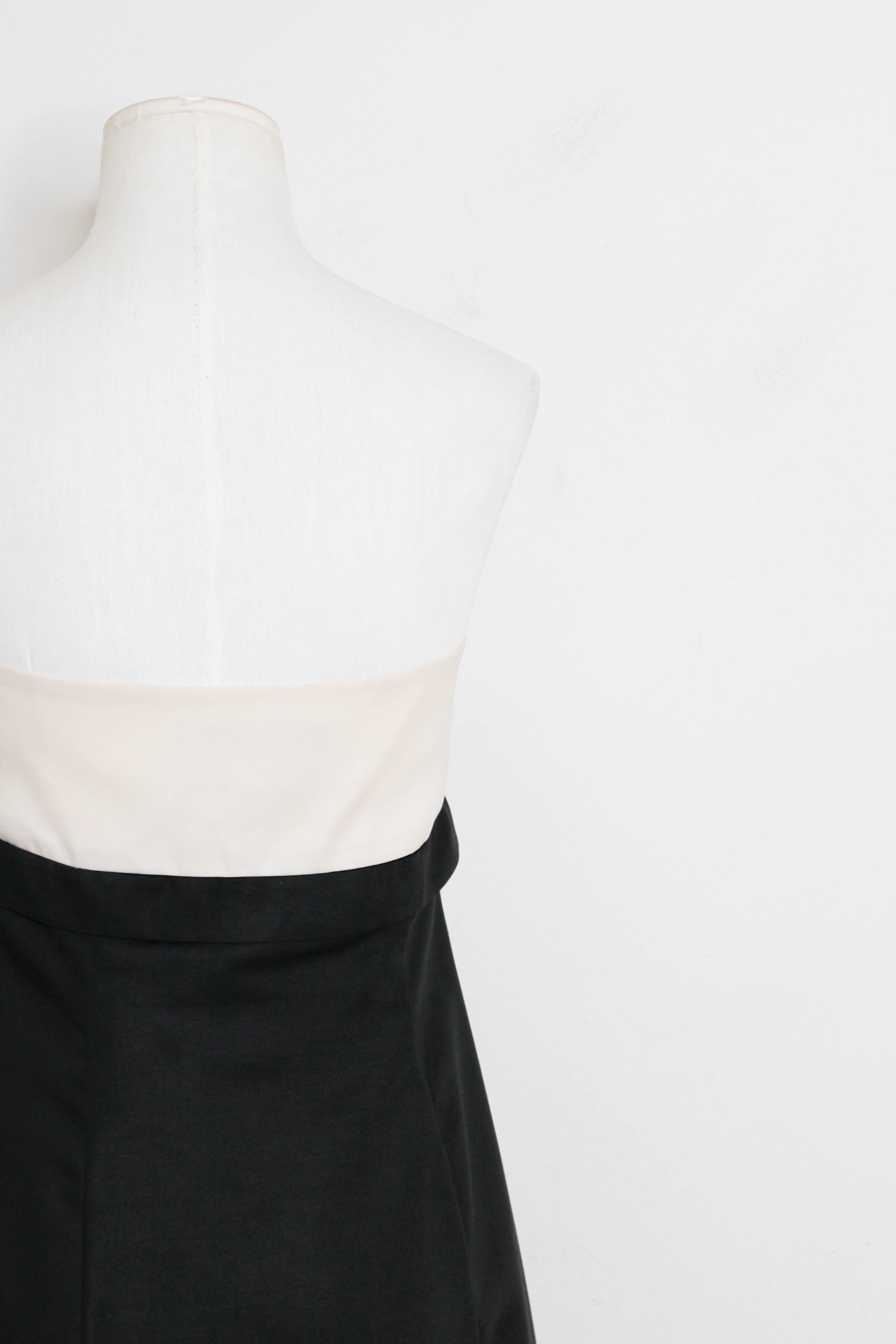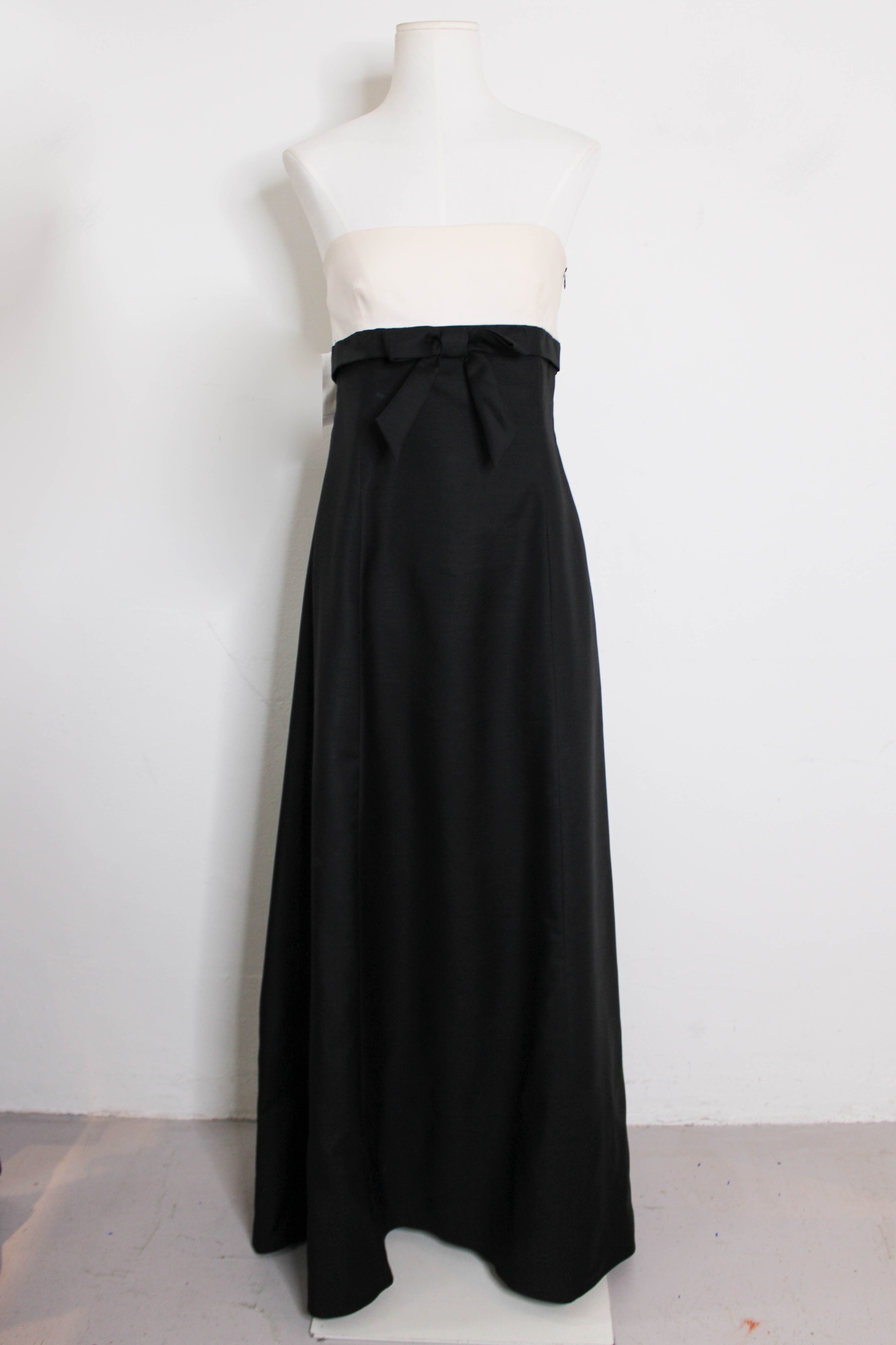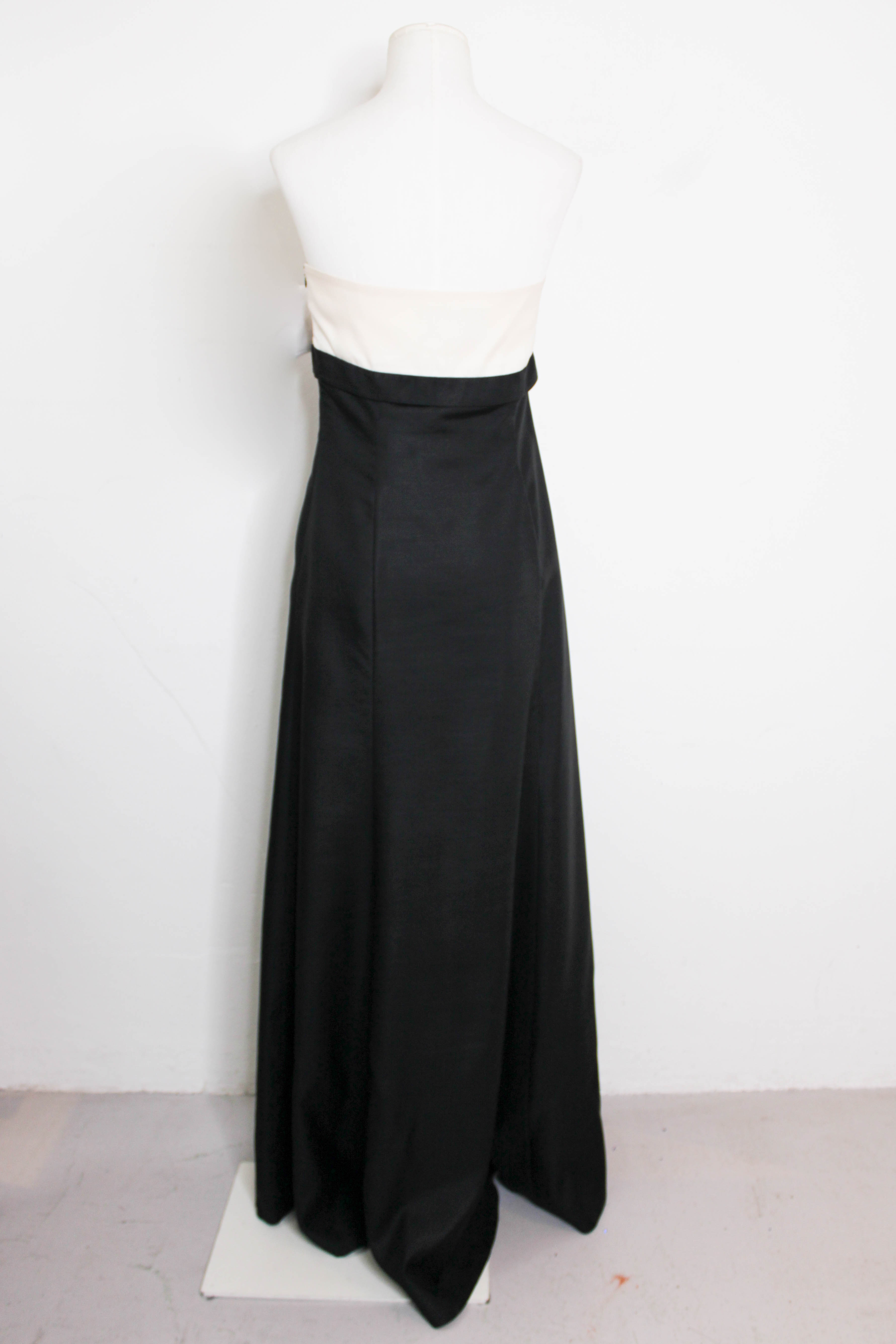 Black maxi dress with ecru bustier. Strapless. 65% wool. 35% silk.