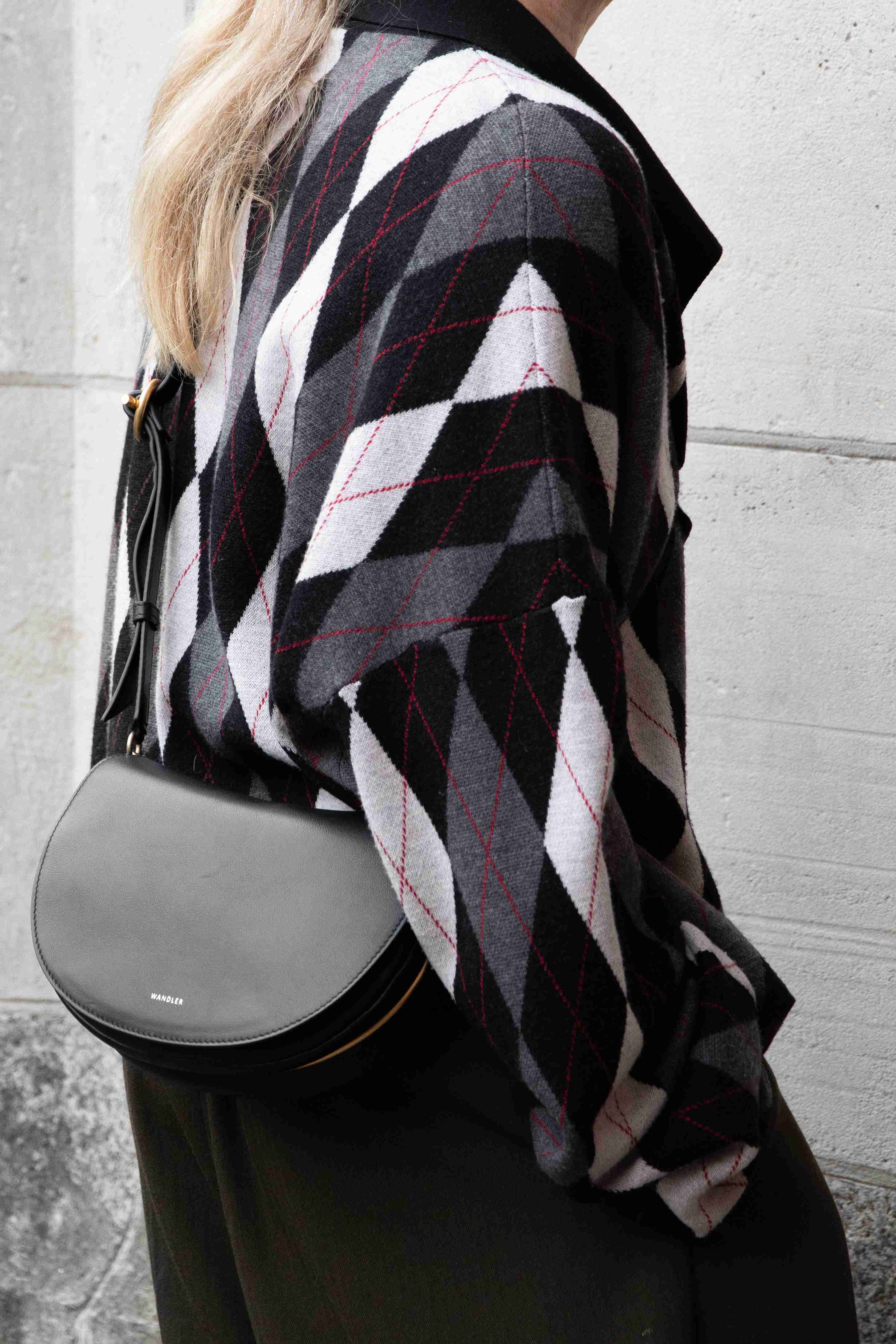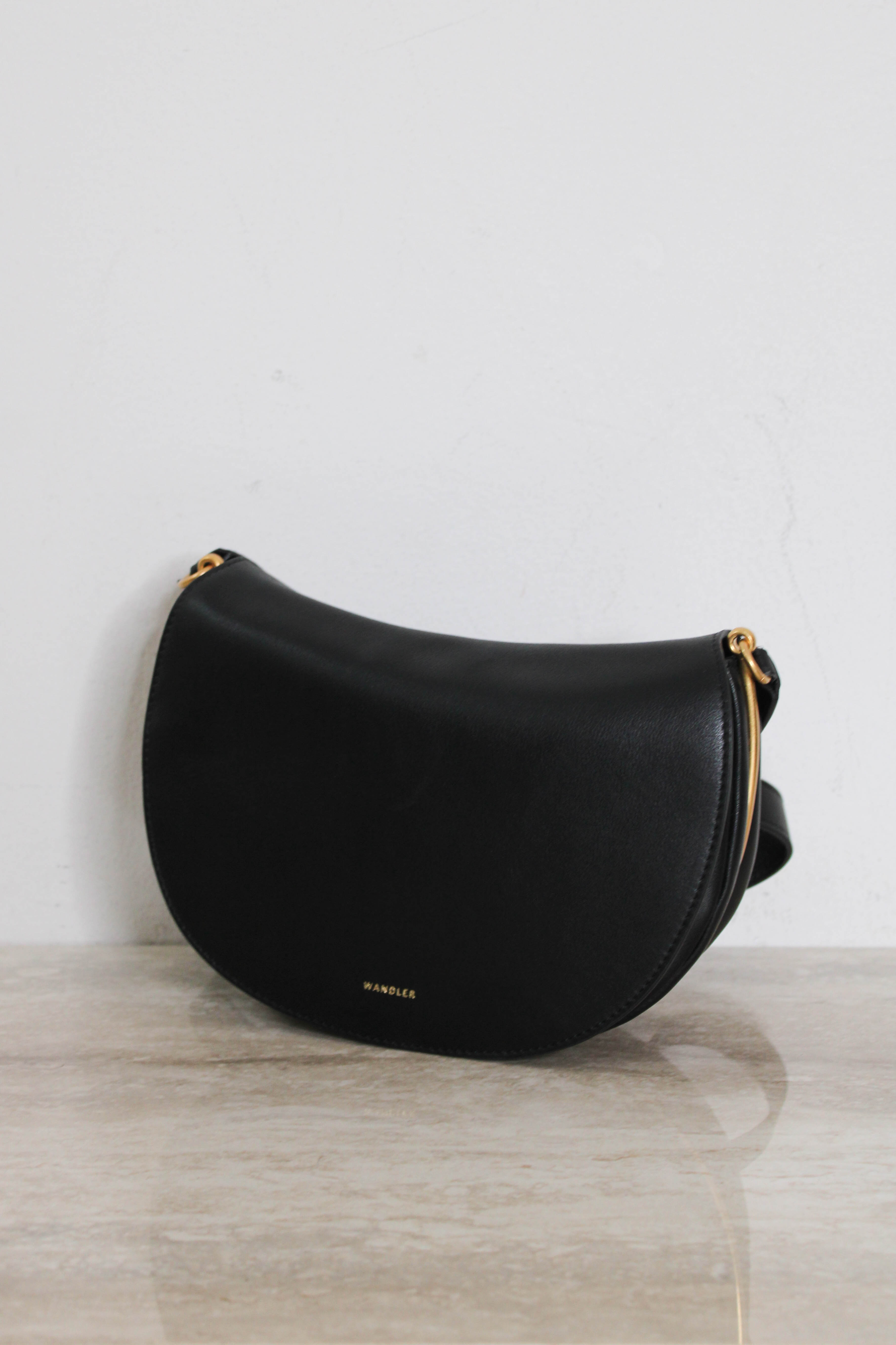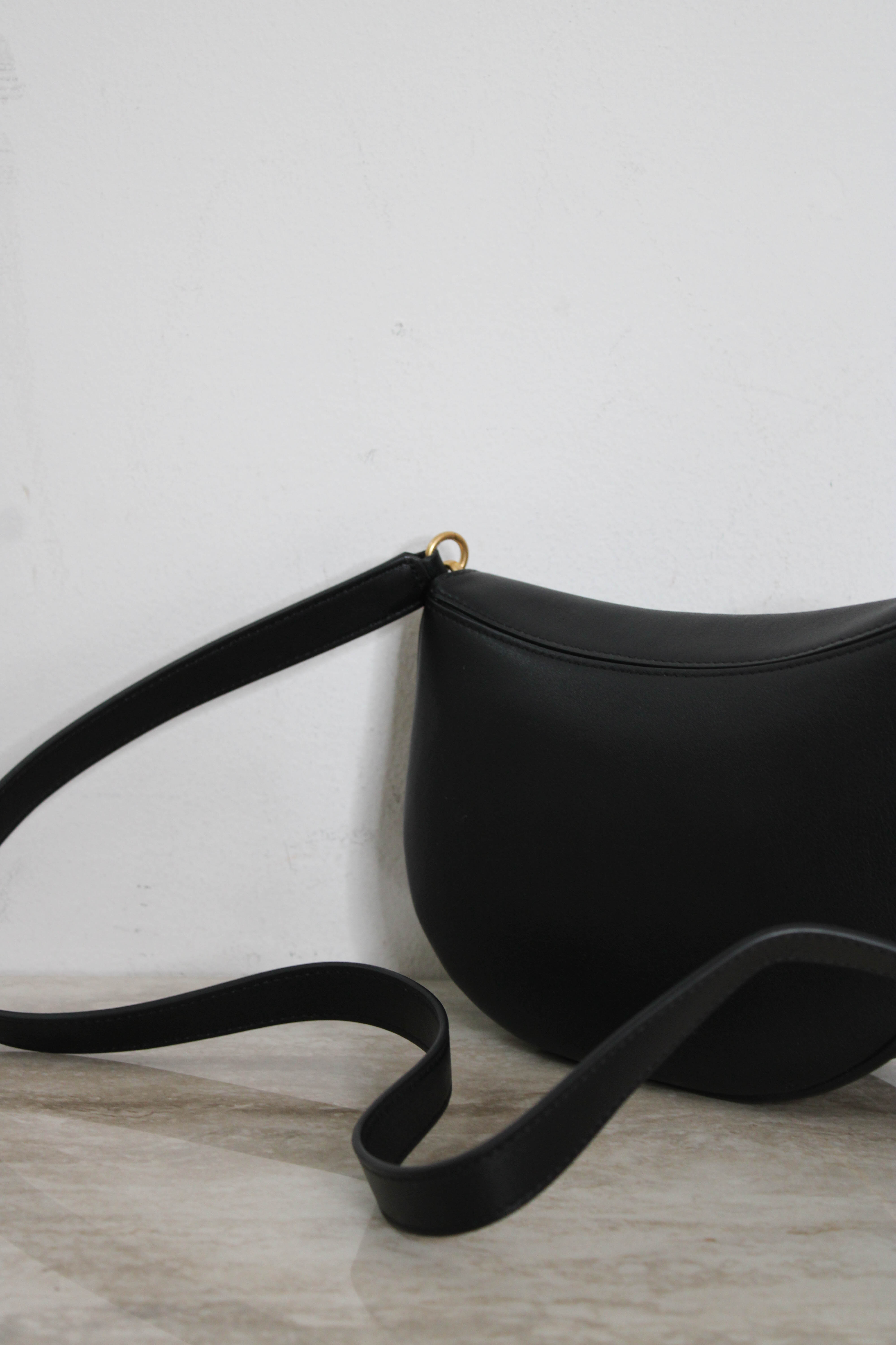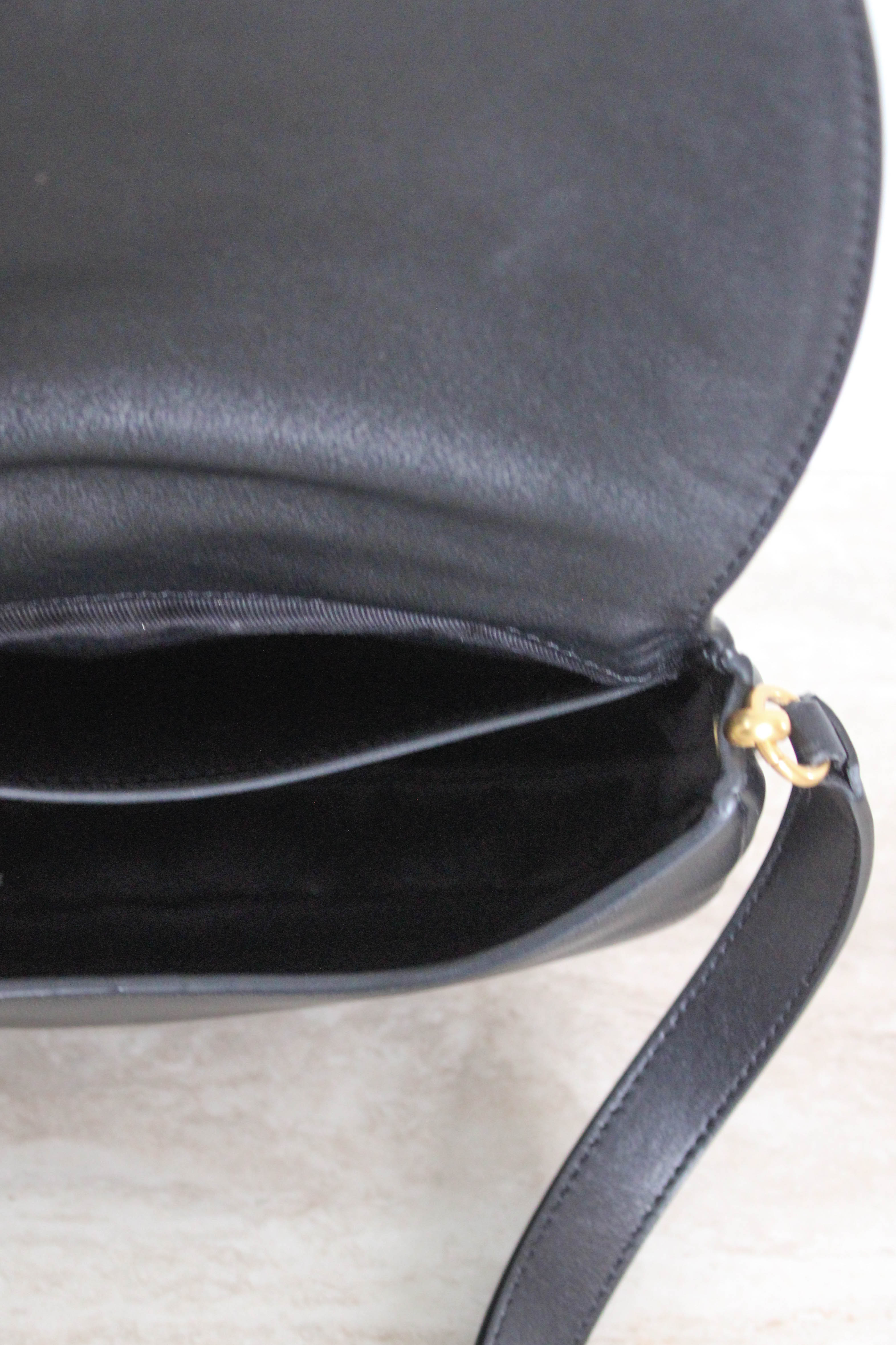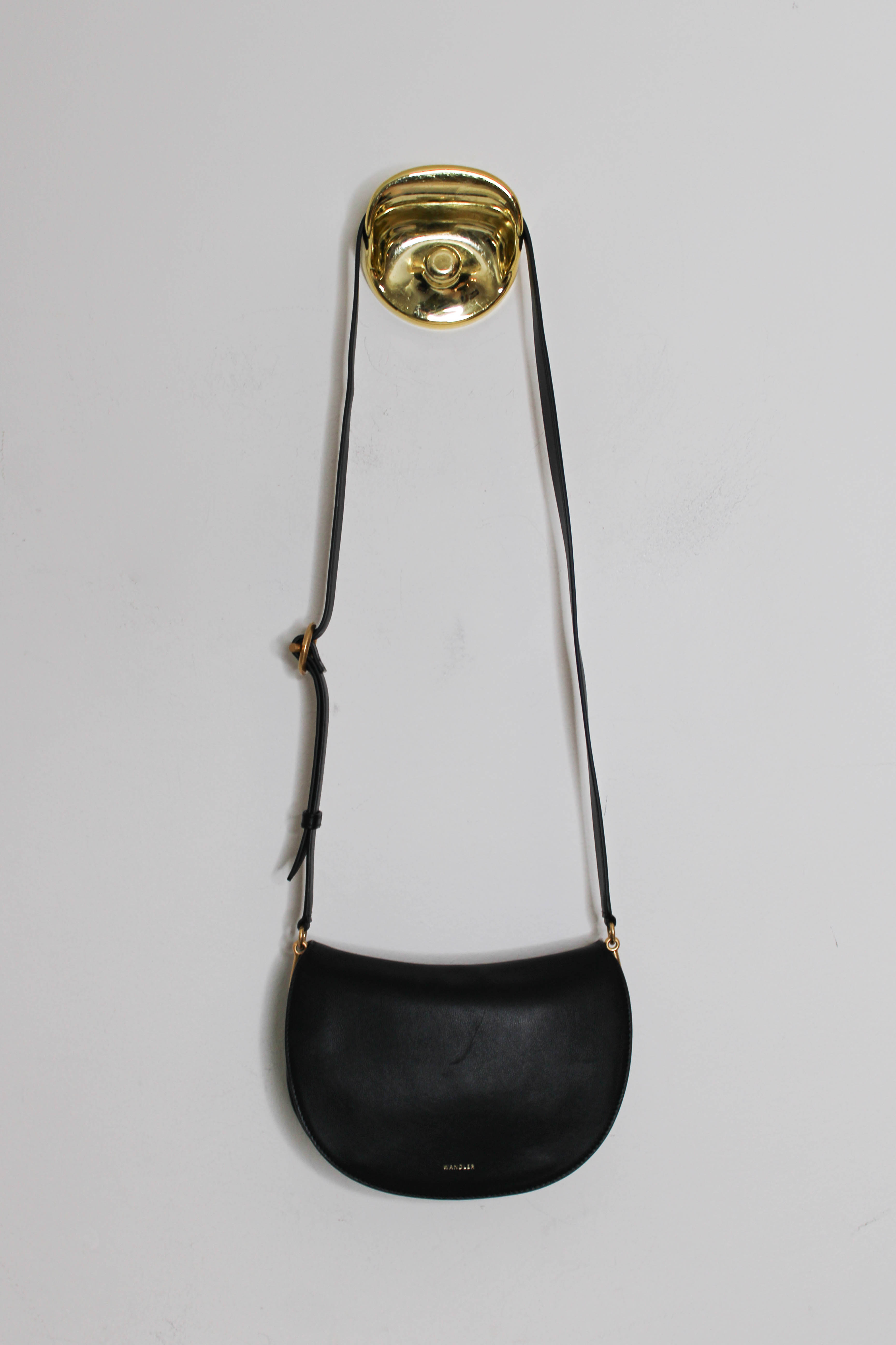 Black leather Kate bag with gold details. Magnetic closure. One small inside pocket. Adjustable shoulder strap.